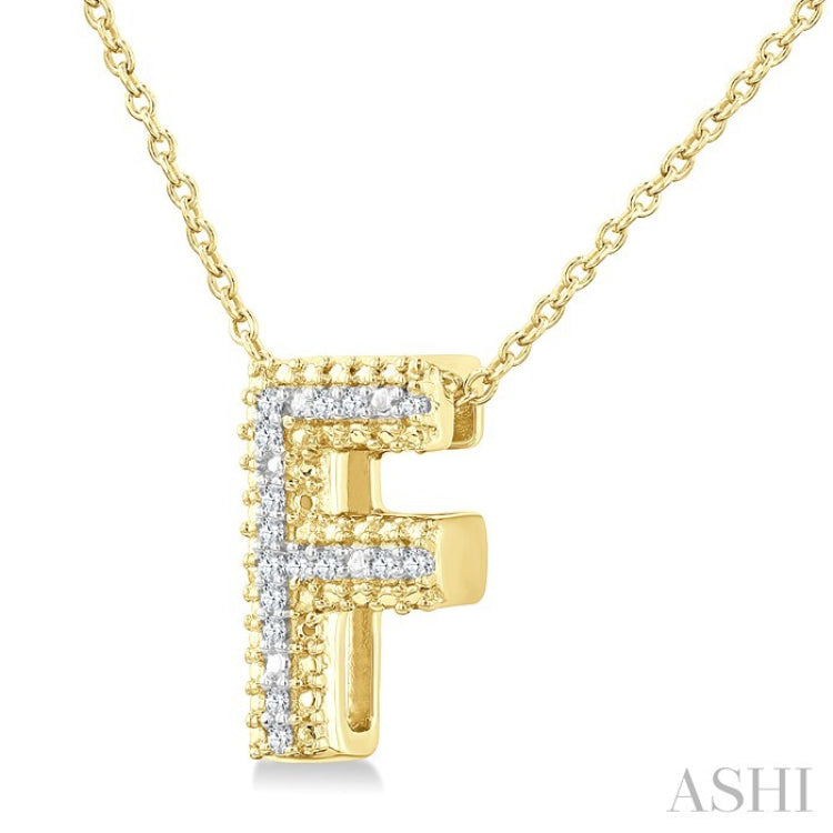 Perfect for gifting or treating yourself, this charming, personalized diamond initial fashion pendant captures the essence of individuality and sophistication. It features a bubble-textured face that adds a touch of whimsy and elegance to the design. The initial 'F' is embellished with 16 prong set round cut diamonds, which sparkle brilliantly against the sleek silver backdrop. Paired with a delicate Cable Chain 1.00 MM in 18 Inches with Spring Lock & Extenders at 16" & 17", both the pendant and chain are styled in a 24kt Yellow Gold Vermeil. Whether worn alone or layered with other necklaces, this stunning initial fashion pendant is sure to become a cherished piece in your jewelry collection. The total diamond weight is 1/20 Ctw.