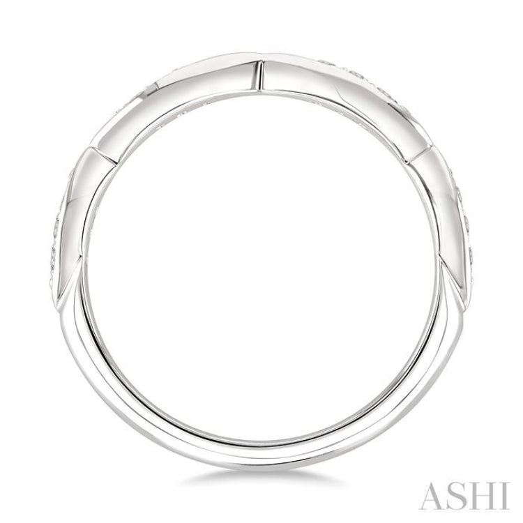 A stackable diamond wedding band, this brings delicate detail and versatile charm to any collection. It features four marquise-shaped mounts carved in a continuous row across the ring top, each adorned with 3 pave hand set round cut diamonds for a total of 12 sparkling accents. Carved in 14 karat white gold with a polished rhodium finish, the diamond wedding band glimmers with refined brilliance while offering durability for everyday wear. Its slim profile makes it ideal for stacking with other bands, yet it also stands beautifully on its own as a subtle statement of style and sophistication. Total diamond weight is 1/10 Ctw.