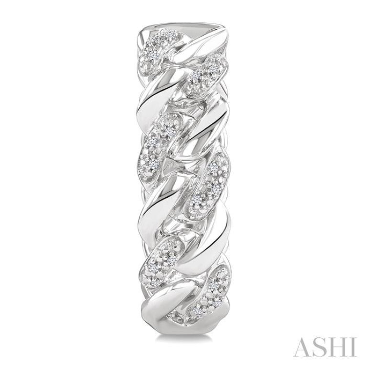 Whether framing the face in daylight or catching spotlight beams after dusk, these diamond Cuban link hoop earrings redefine classic Cuban links with just the right measure of brilliance. From front to back, a sleek sequence of alternating Cuban links defines the hoops, with plain silver links giving way to diamond-adorned links on each hoop front, offering a sophisticated interplay of texture and sparkle. A total of 36 pave set single cut diamonds embellish the hoop front, 18 on each hoop. Engineered for comfort, a lever-back closure secures the diamond Cuban link hoop earrings. The rhodium-plated silver setting accentuates the crisp fire of the diamonds. Total diamond weight is 1/10 ctw.