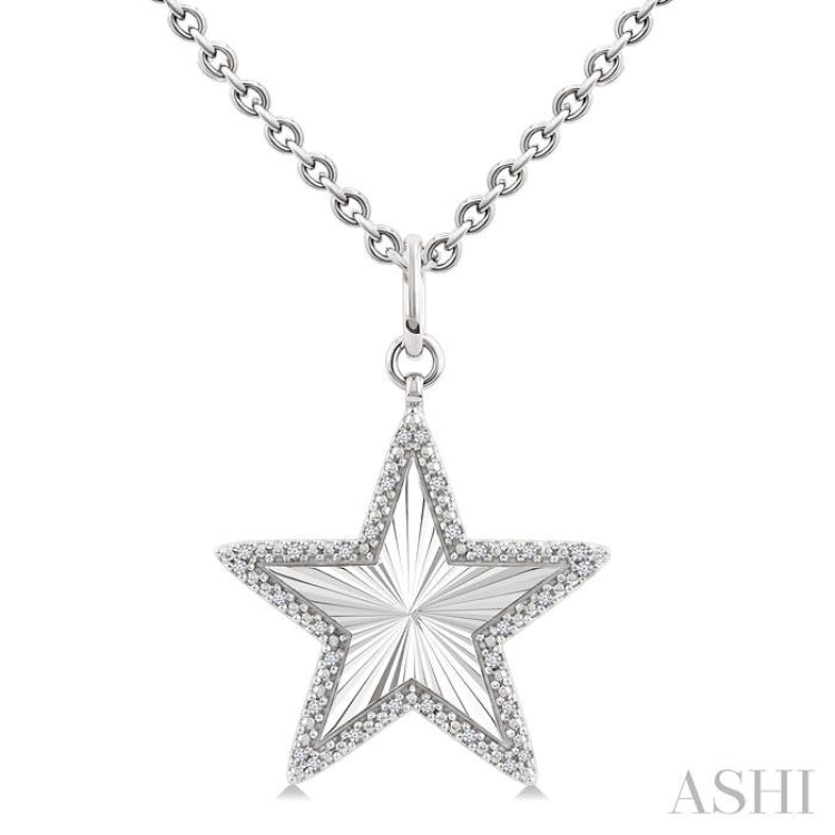 In many traditions, the star represents guidance, ambition, and the promise of brighter horizons, an emblem of both personal aspiration and timeless wonder. Wear this medallion pendant as a daily compass or gift it to someone who inspires you; its celestial motif will shine as a constant reminder that even the smallest glimmer can light the way. The pendant features a star-shaped cutout showcasing a fluted surface, bordered by 30 prong hand set single cut diamonds, their combined sparkle forming a luminous frame against the textured surface. A plain bail and connecting circular link guide the medallion pendant onto an Oval Link Chain 4.50 MM in 18 Inches with Lobster Lock, all crafted in rhodium finish silver. Total diamond weight is 1/10 ctw.