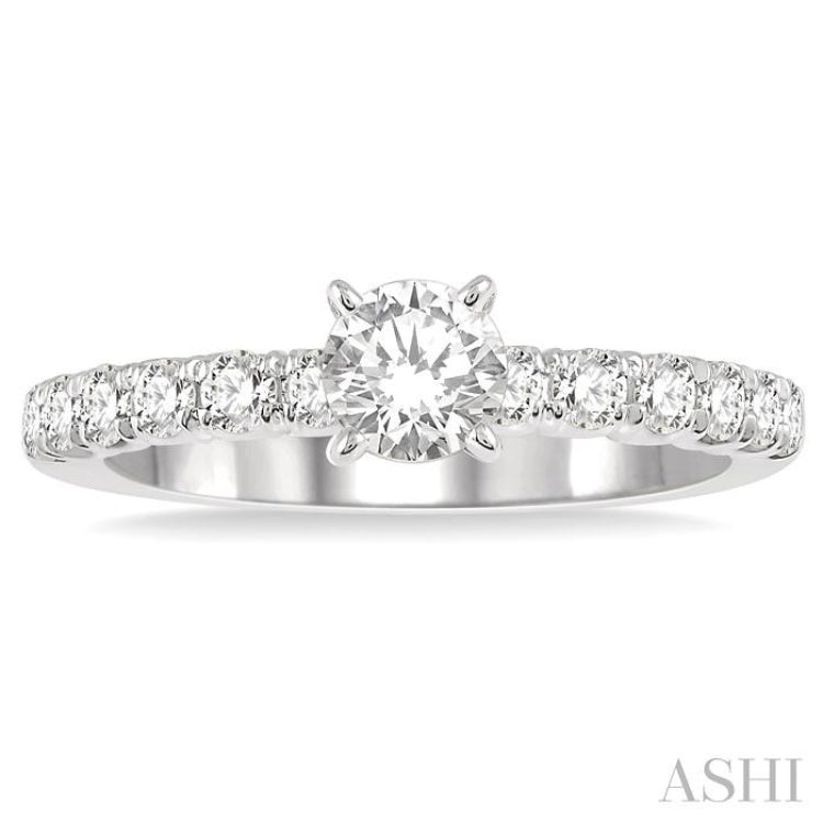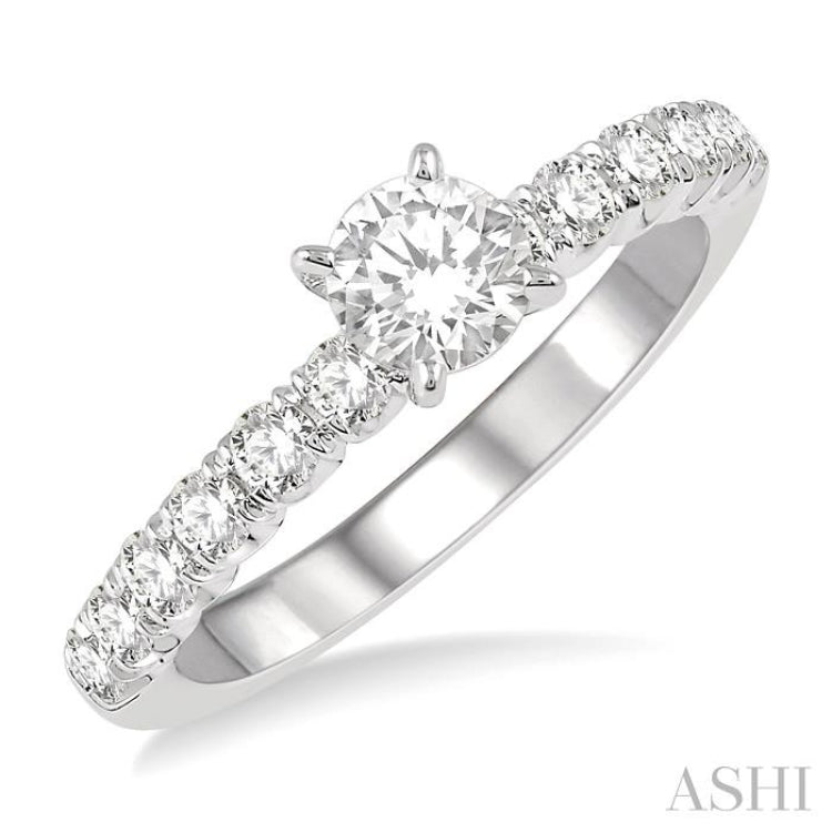1 Ctw Diamond Ladies Engagement Ring with 1/2 Ct Round Cut Center Stone in 14K White Gold