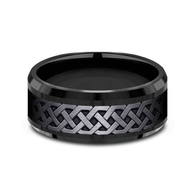 9mm, Comfort fit Black Titanium Celtic knot patterned center, bevel edges