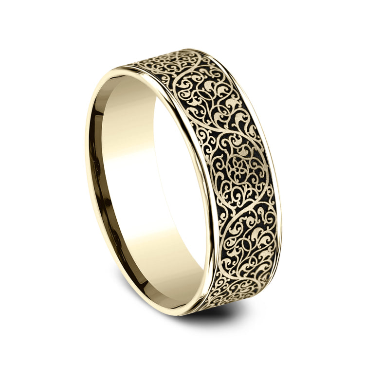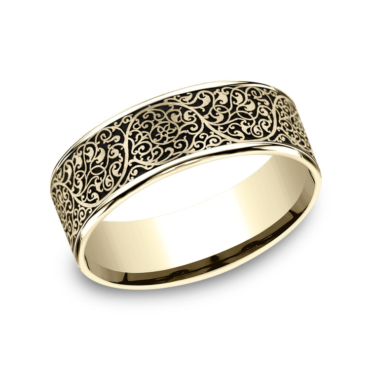 7.5mm, Comfort fit 14K Yellow Gold Arabesque design, thin edges