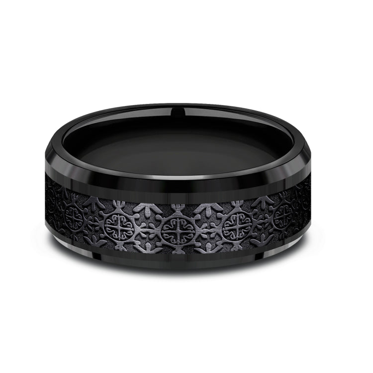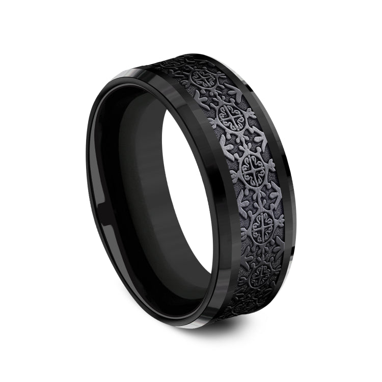 8mm, Comfort fit Black Titanium Intricate patterned center, polished bevel edges
